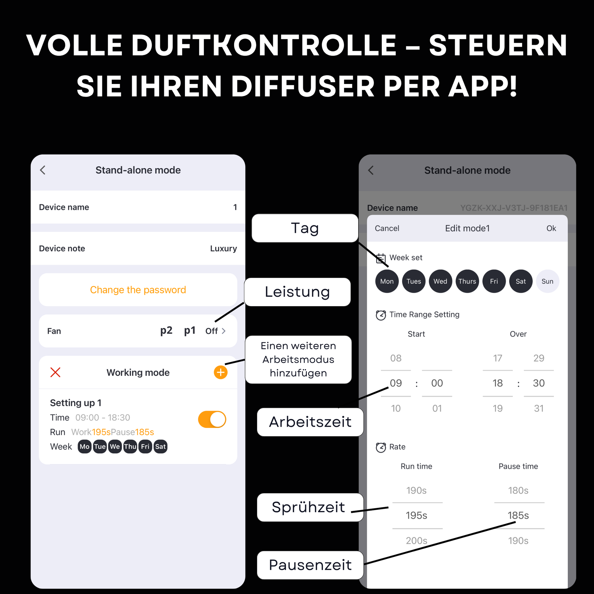 Der Aroma Diffuser A300 lässt sich einfach per Bluetooth-App steuern. Über Ihr Smartphone können Sie die Duftintensität, Timer und Intervallprogramme individuell anpassen – ganz nach Bedarf. Diese smarte Steuerung macht die Nutzung komfortabel und effizient, auch bei professionellem Einsatz.
