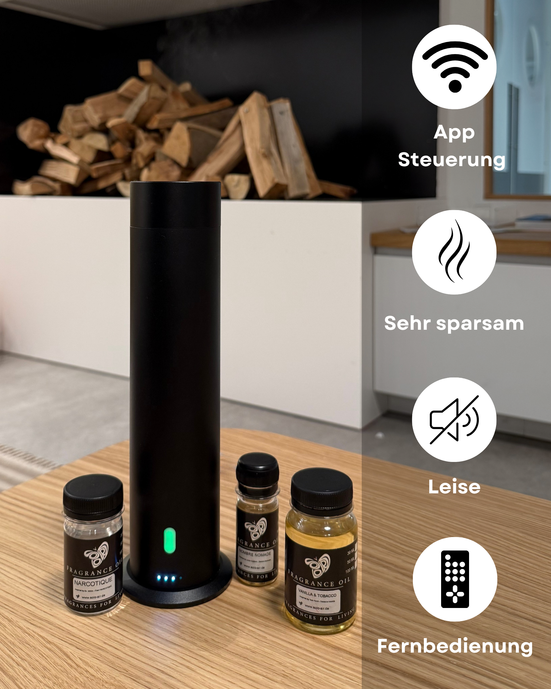 Der CH124 ist nicht einfach ein Diffuser â er ist ein Statement fĂŒr Stil und Komfort. Sein edles schwarzes AluminiumgehĂ€use fĂŒgt sich nahtlos in jedes Interieur ein, wĂ€hrend die intelligente Duftsteuerung per WLAN oder Fernbedienung Ihnen volle Kontrolle ĂŒber IntensitĂ€t und Laufzeit gibt. So schaffen Sie Ihre persönliche DuftatmosphĂ€re â wann und wie Sie möchten.
