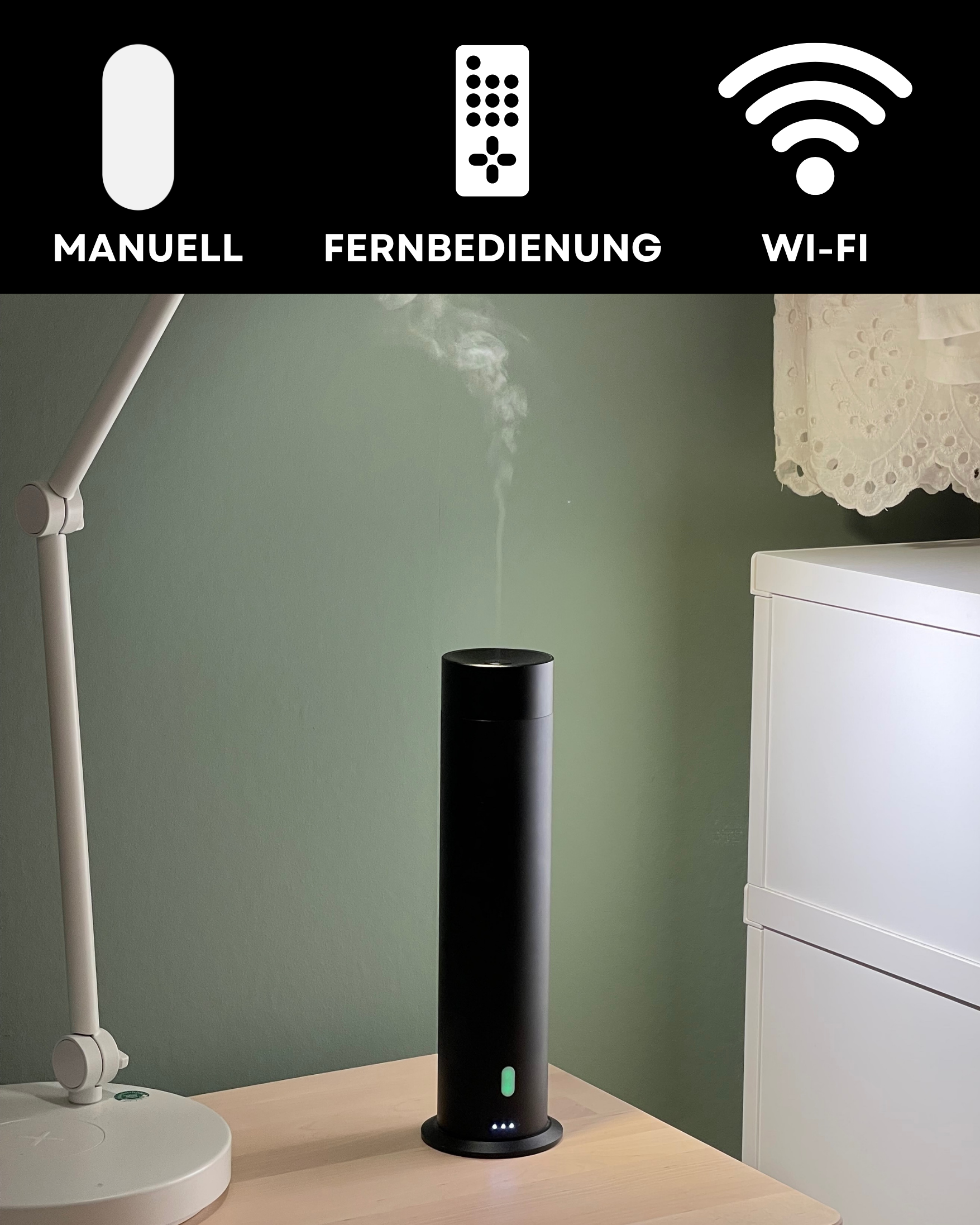 Sie haben die Wahl: Steuern Sie den Diffuser direkt am GerĂ€t, per Fernbedienung oder bequem ĂŒber Ihr Smartphone via Wi-Fi. Legen Sie individuelle Timer fest, passen Sie die IntensitĂ€t an oder aktivieren Sie ihn automatisch nach Ihrem Tagesrhythmus.