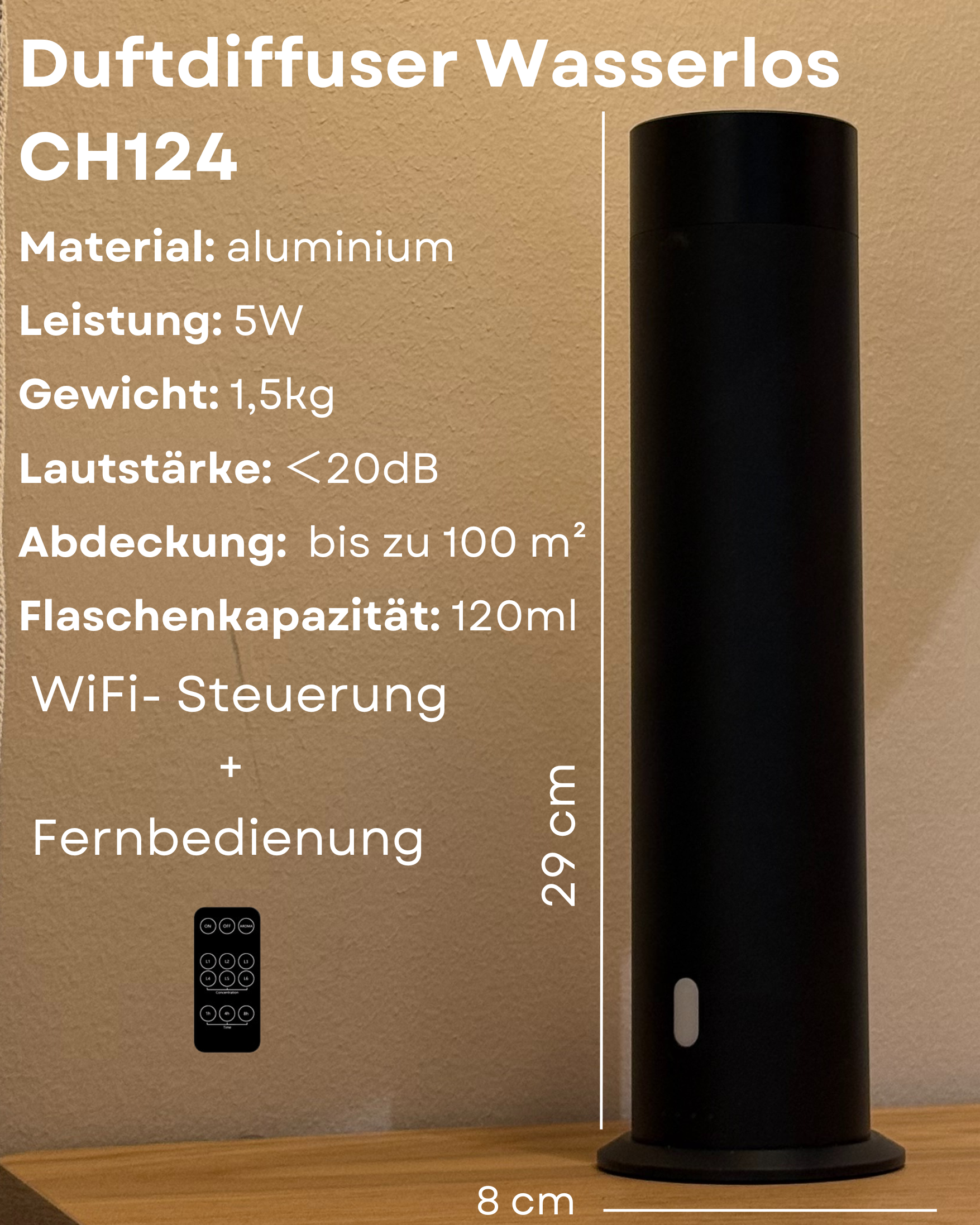 Erleben Sie modernen Raumduft in seiner reinsten Form â mit dem Aroma Diffuser CH124 Schwarz. Dieses elegante, wasserlose Duftsystem kombiniert leistungsstarke Nanotechnologie mit smarter Steuerung per Wi-Fi oder Fernbedienung. Ideal fĂŒr Wohnungen, BĂŒros, Studios oder kleine GewerbeflĂ€chen bis 100 mÂČ.