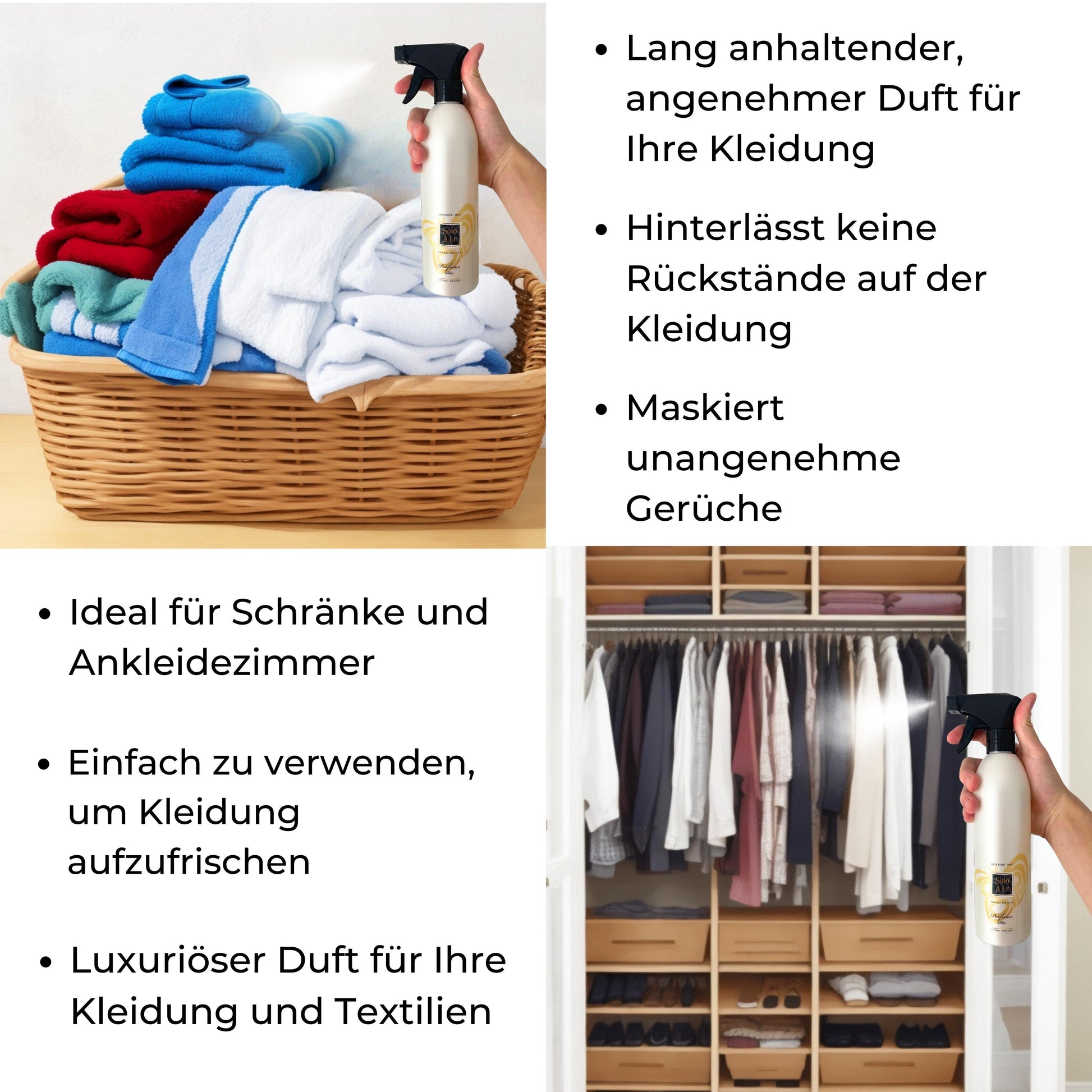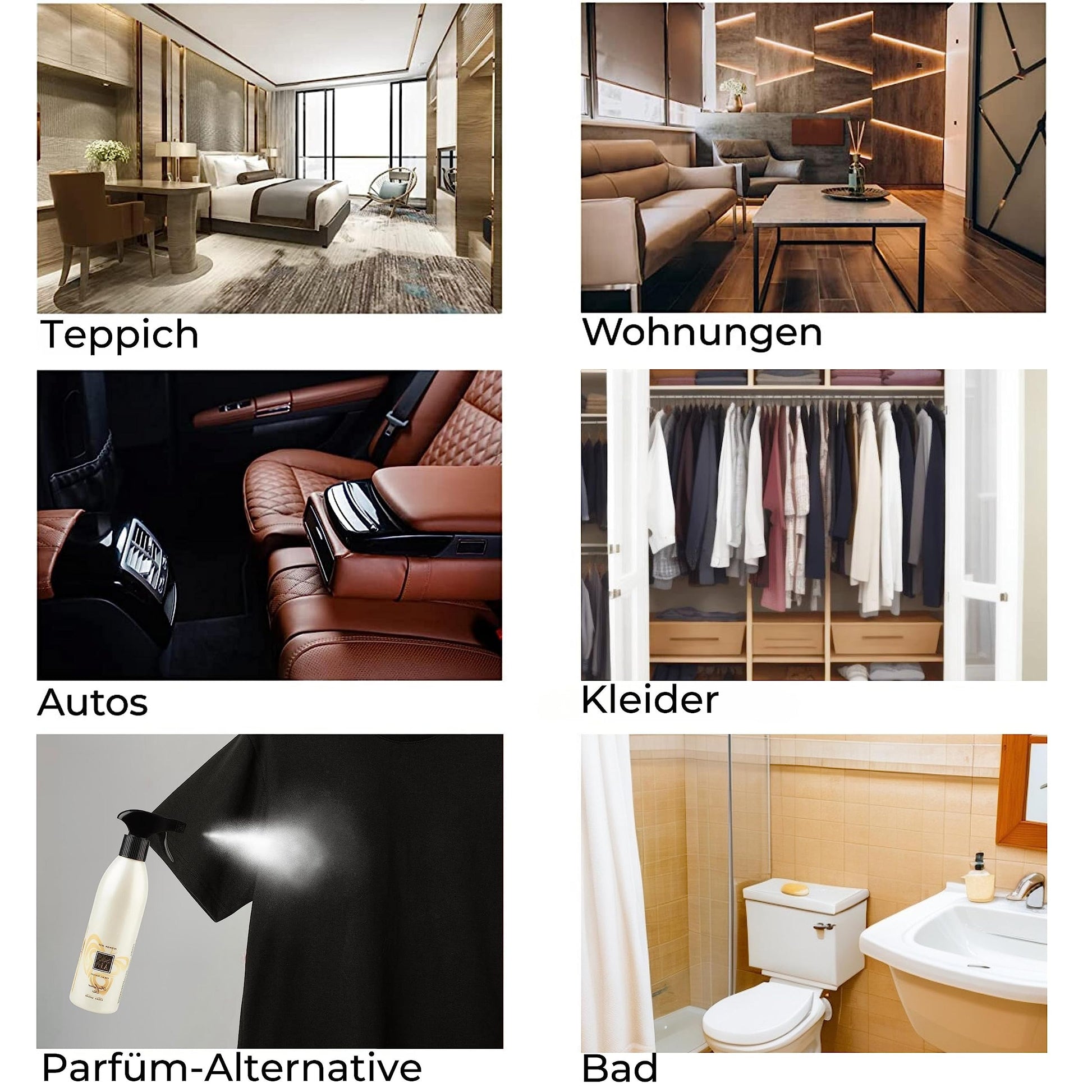 Unsere vielseitigen Möglichkeiten: Raumspray, Textilerfrischer spray, Duftspray für Kleidung, Geruchsneutralisierer und Autoparfüm